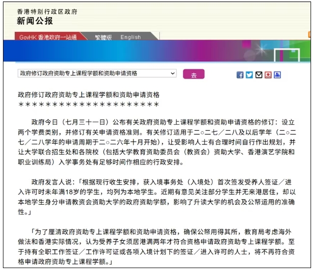 第二个变局,来自港府对“本地生”身份的重新界定。现在,临时港宝必须在港“连续就读两年”,才会被算作本地生,从而享受香港高校对本地生的招生名额和学费优惠。